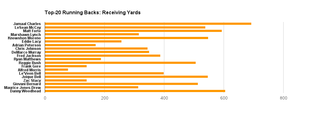 So if you still think guys like Eddie Lacy and Adrian Peterson dominate fantasy football leagues, you are sadly mistaken my friend. As you can see in the chart below, the running backs who finished as top-20 running running backs in 2013 were able to boost their stats and stay healthy when they were heavily involved in the passing game. You will have anomalies such as Alfred Morris and his 78 receiving yards, but the future of fantasy football involves the backs who can help their quarterbacks beyond little dump offs. As you can see in the chart below, running backs in the top 20 had an average of 381.70 receiving yards and close to two touchdown receptions on the season.