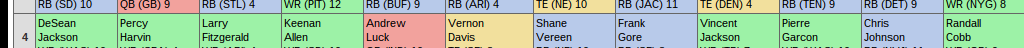 Jack’s Thoughts: Manning was off of the board, and after this pick, I would to wait 10 more picks until I got to make another selection. That was too risky to wait for Brees or Aaron Rodgers, so I scooped up Brees. I want a top-three quarterback to lead my team at all times, and missing out on running backs and wide receivers is the price you pay.