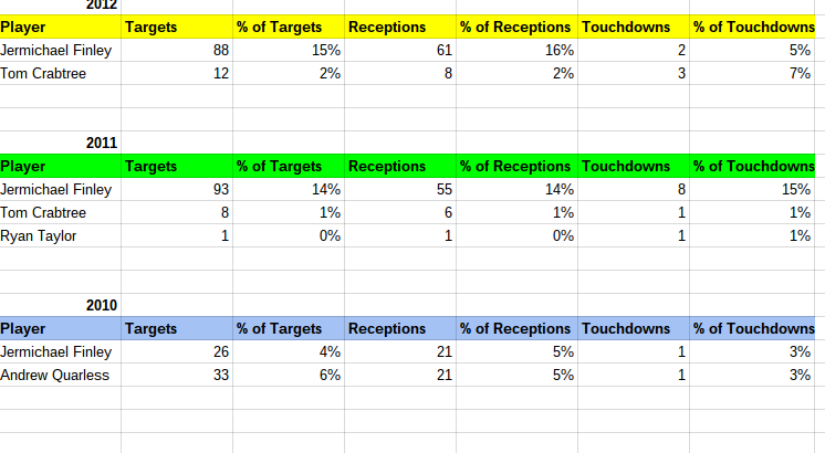 I broke down the numbers of tight ends that scored at least one touchdown from 2010-2012 to see what kind of numbers Jermichael Finley‘s replacement could produce.