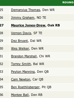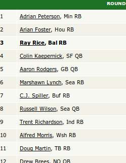 This is a standard scoring league, but as you can tell, there are several players who love to jump the gun on quarterbacks. With the third pick in the draft, however, that didn’t really alter my strategy. I was really torn between Rice and C.J. Spiller at this spot. Spiller showed some great potential in the previous year, and I loved that he was going to run until he “threw up”. Obviously Spiller and Rice were both busts, but if you look at the first round of the draft, Adrian Peterson was the only running back selected that finished in the top 10. At the time, I believe I made the right call. Rice had proved to be a reliable option from year to year, and I thought he would see an increase in his receiving yards as Anquan Boldin was gone and Dennis Pitta was injured. I can’t say I would have done anything differently here with the information that was available at the time.