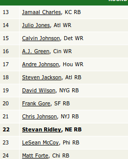 I had a huge grudge with LeSean McCoy from the year before. He was also my third pick from 2012, and he was a huge disappointment. I thought he was a candidate for a bounce-back year, however, and I even ran through some scenarios where I drafted him in the first round. I loved Ridley’s 12 rushing touchdowns from 2012, however, and he seemed like a workhorse back with his 290 rushing attempts in that same year. When it came time to make a pick, I was too worried about another poor fantasy season from McCoy, so I went with Ridley. I let fear play into my decision for my second-round pick, and fear proved to get the best of me. I made the wrong decision.
