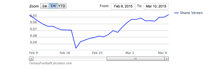 Vereen has been hovering as a ninth-round pick on FantasyFootballCalculator.com over the past month, and I think Fantasy Football players may be weary of him because of the three-headed attack the Giants seem to be employing.
