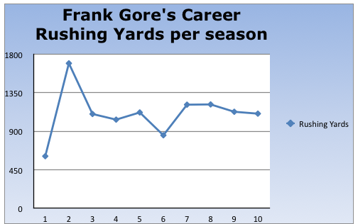 The first question we need to ask ourselves is can he produce if given the large workload? If you know anything about Frank Gore, you already know he can more than produce when given the opportunity but just to be safe, let’s take a look at some numbers.