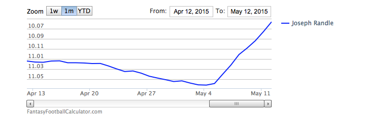 As you can see, Randle’s average draft position has made a big jump over the last few days. He went from the 11.06 pick on May 4th to a 10.5 pick on May 12th. I think that’s a pretty nice spot to snag him now, but as the season approaches I’m sure he will be drafted much earlier.