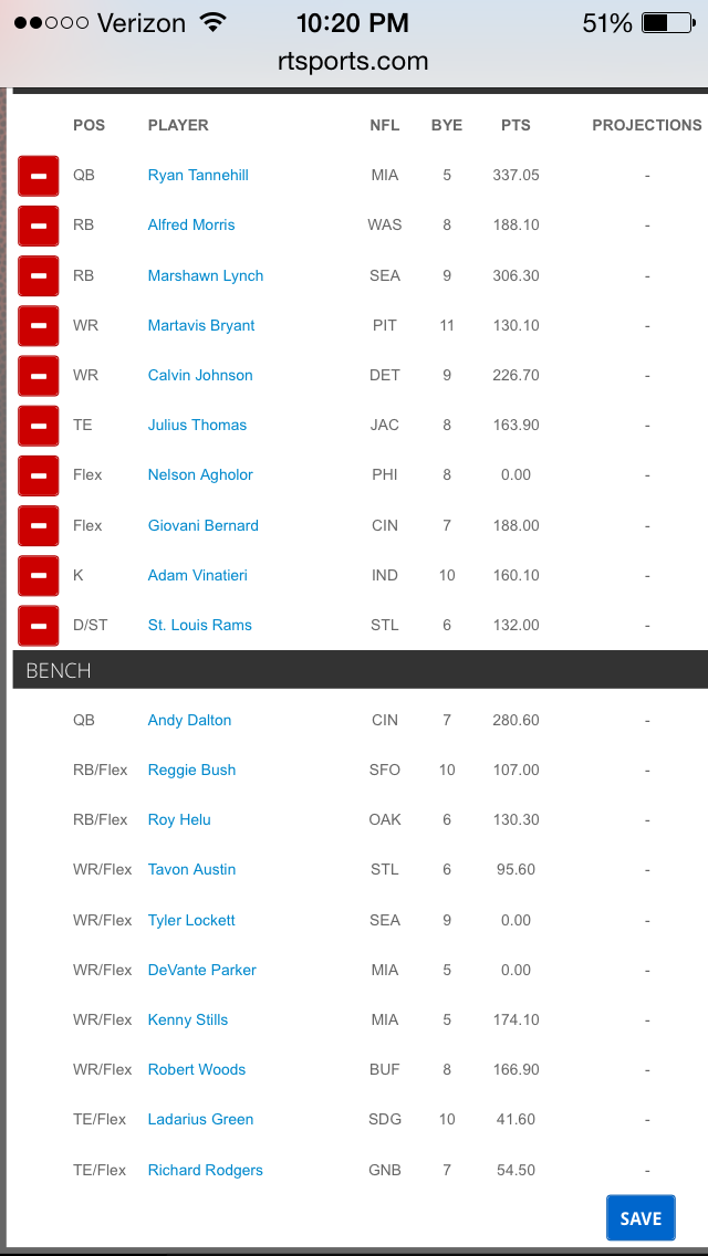 In the later rounds of the draft, it is imperative to add more depth along with prospects that you believe may hold some value during the season. In rounds 10-20, we added guys like Roy Helu, Kenny Stills, and Tavon Austin (in no particular order). We went with the St. Louis Rams D/ST who we feel has a strong chance at leading the league in sacks and has a great special teams. Kickers are meh, but we got Adam Vinatieri who is obviously going to be kicking many PAT’s this season.